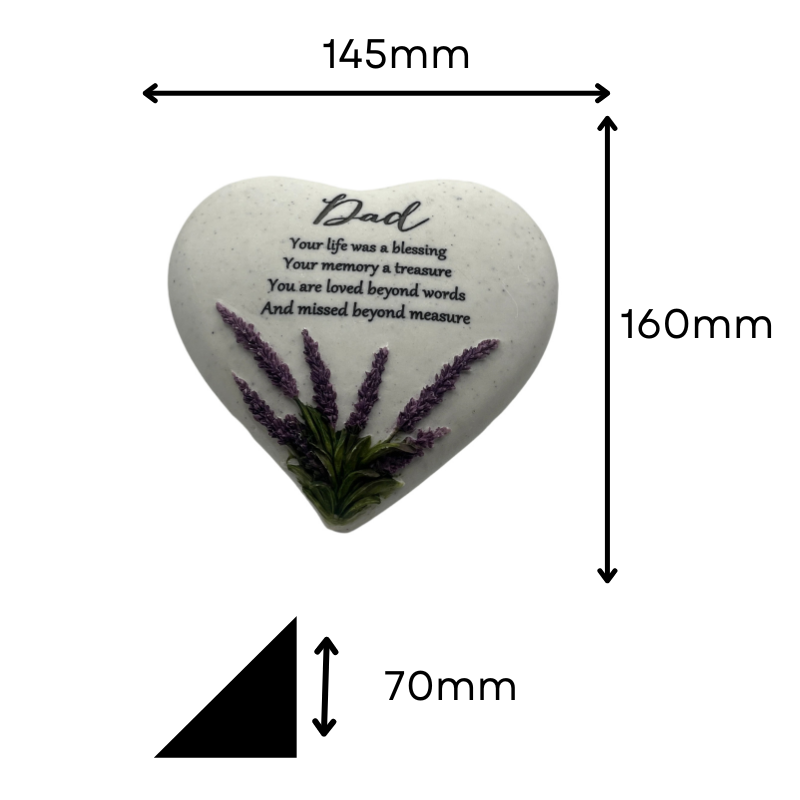Our Dad Heart Lavender Memorial is a beautiful and thoughtful way to honour the memory of a beloved father. This memorial piece symbolizes peace, love, and remembrance, shaped in the form of a heart and delicately adorned with a lavender design. Made from durable, weather-resistant materials, it is designed to last through all seasons.