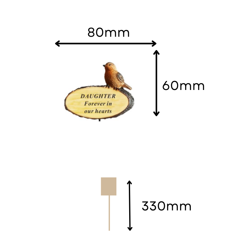 Our Daughter - Perched Robin Memorial Plaque on Stake is a heartfelt tribute designed to honour the memory of a beloved daughter. Featuring a beautifully detailed robin perched on the plaque, this memorial piece symbolizes hope and remembrance. Crafted from durable, weather-resistant materials, it comes with a sturdy stake for easy placement in outdoor settings.