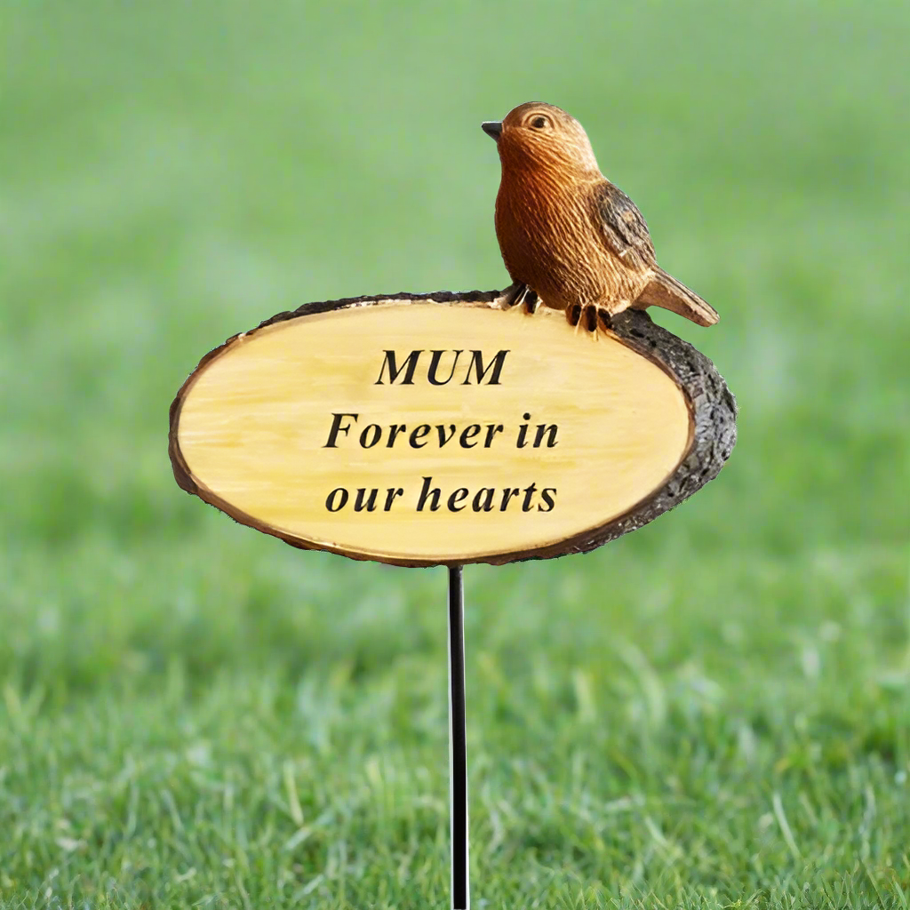 Mum - Perched Robin Memorial Stick - Forever In Our Hearts - Ideal For Gravesides and Gardens