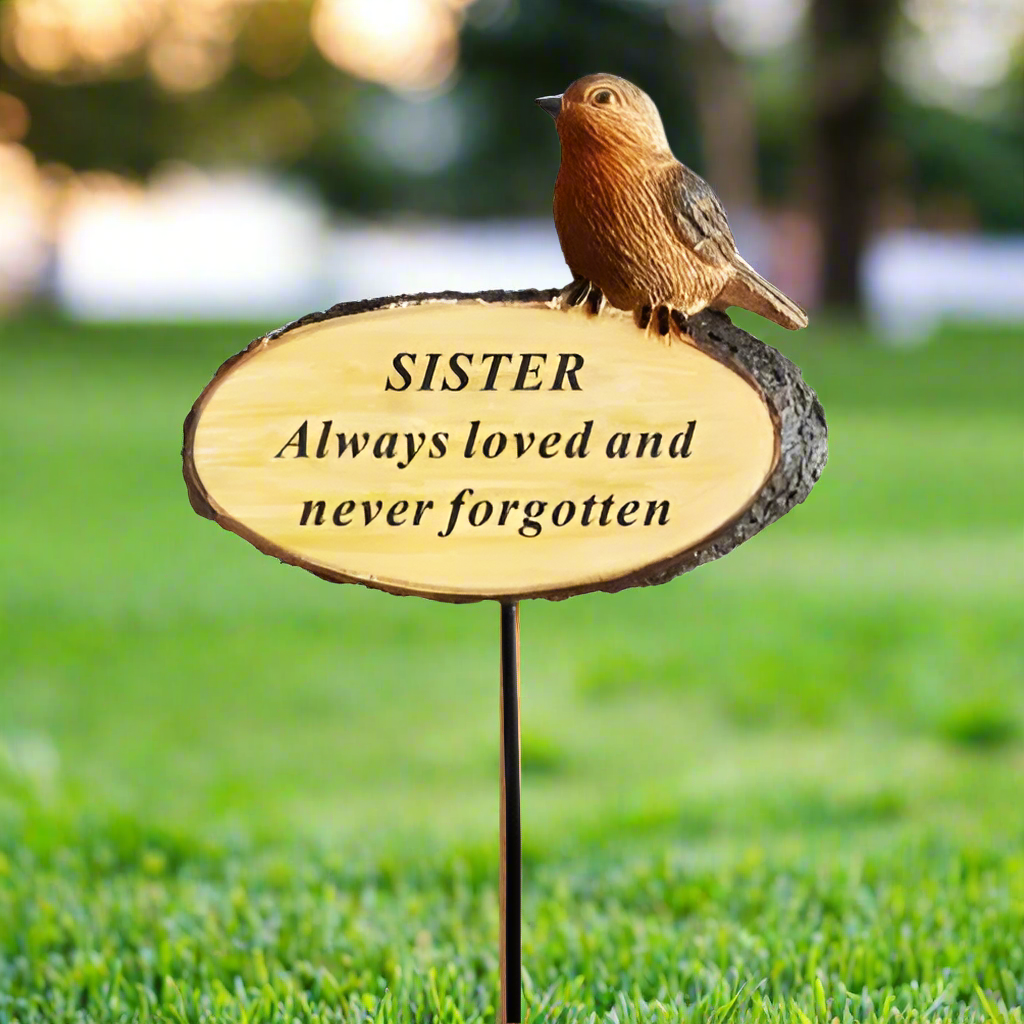 Sister - Perched Robin Memorial Stick - Always Loved and Never Forgotten - Ideal For Gravesides and Gardens