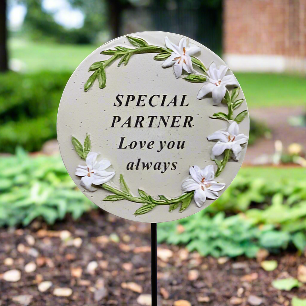 Our Partner - Memorial Stick in grey with delicate floral detail is a beautiful way to honour the memory of a cherished partner. The elegant floral accents symbolize love and remembrance, providing comfort to those who visit. Made from durable, weather-resistant materials, this memorial stick is perfect for outdoor placement, ensuring it remains a lasting tribute.